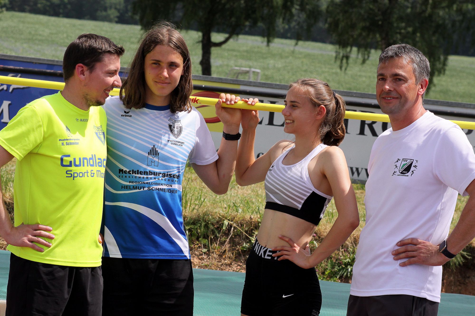 BU : Trainer und Athleten beim Fachsimpeln an der Hochsprunganlage (von links) Timo Beckmann, Leonard Figge, Alicia Stehl und Frank Siesenop. (zct)