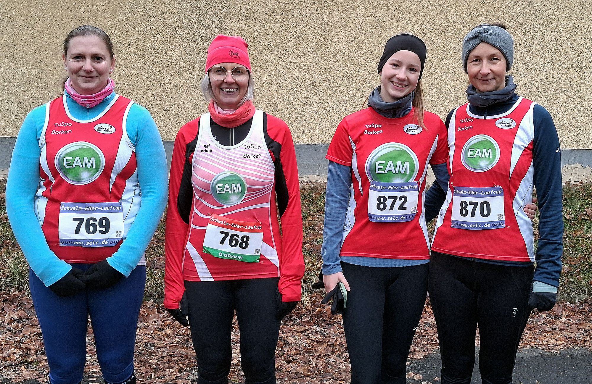 Bild 2Frauen: Erstmals seit 2018 sicherten sich die Athletinnen des TuSpo Borken im Schwalm-Eder-Laufcup mit (von links) Anne Hummel, Katja Stilting, Marie Südmeyer und Yvonne Südmeyer die Mannschafts-Trophäe der Frauen. Es fehlt Johanna Degenhardt. (zct)