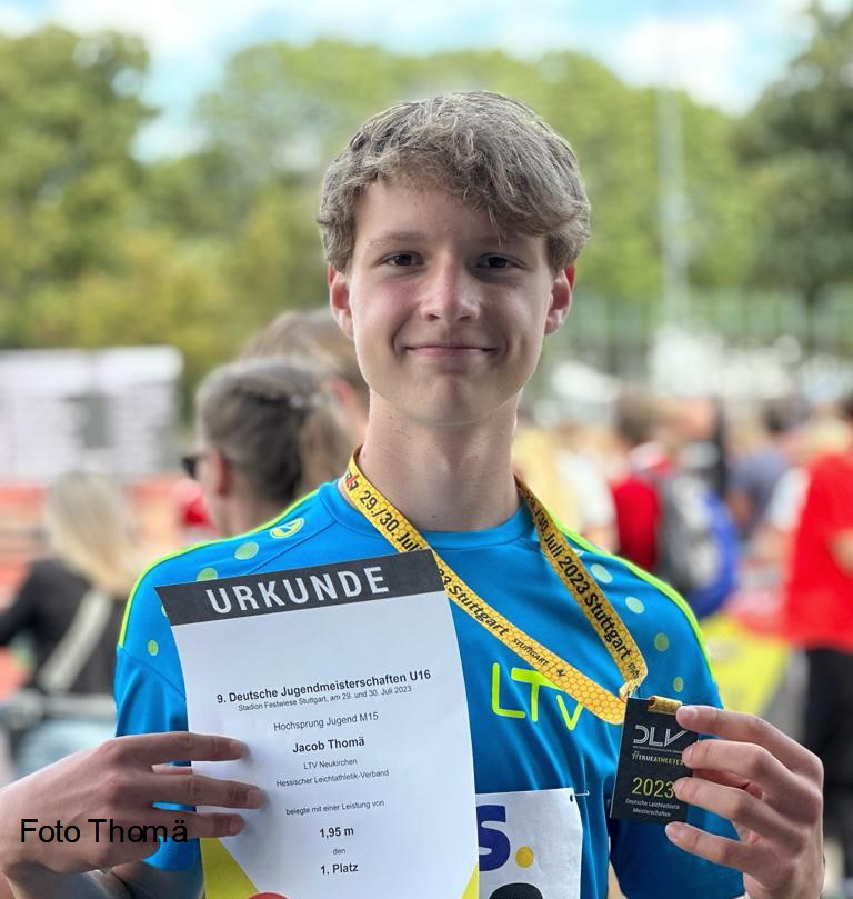 Doch die vom DLV ebenfalls geforderte Zusatzleistung erwies sich als recht zäh bis bei den Titelkämpfen in Bad Wildungen sowie in Neu-Isenburg die geforderten 2500 Punkte im Mehrkampf Sprint/Sprung in trockenen Tüchern waren. Mit den bei seinem Sieg bei der Süddeutschen Meisterschaft in Aichach überquerten 1,91 Meter führt der von LTV-Trainer Günther Wawrauschek entdeckte und aufgebaute Nachwuchs-Athlet die Meldeliste an. Niklas Quast (SV Nauen/1,86 m) sowie Josiah Reiter (LAC Chemnitz/1,85 m) sind die stärksten Gegner. „Trotz aller Rivalität unter den jungen Athleten kommt der Spaß am Sport sowie am fairen Wettbewerb an sich nicht zu kurz“, sagt Jacob Thomä.
