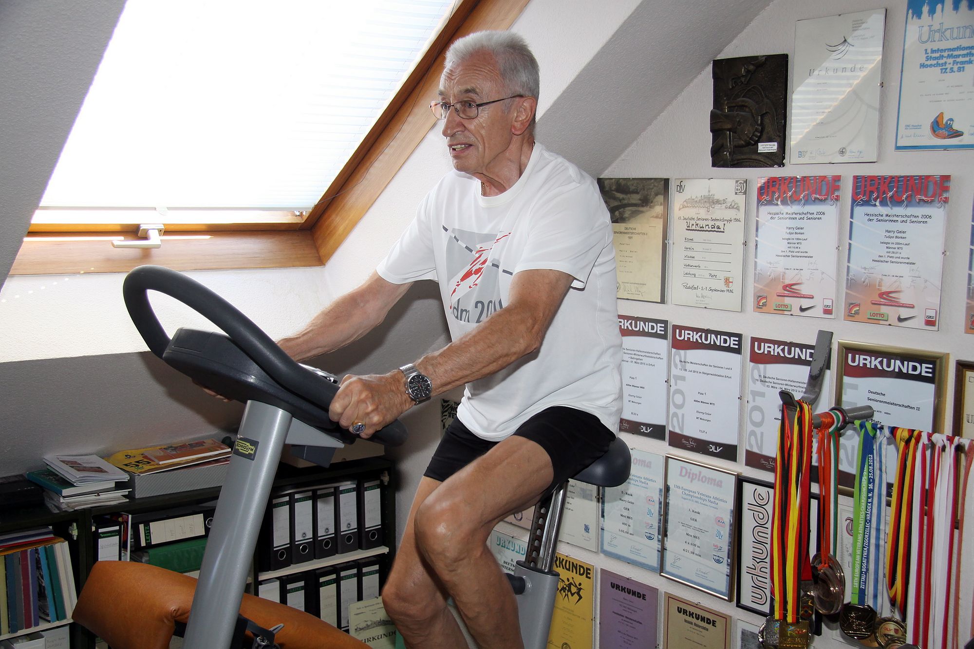 Zum Sport kam der in Karlsbad Geborene erst im Mittelalter des Lebens. Am Anfang trabte er als Volksläufer durch die Wälder und wurde Marathonläufer. Fünf hat er absolviert. Den schnellsten in 2:58:50 Stunden. „Mein Beruf als Uhrmachermeister hinderte mich am Besuch fester Übungsstunden“.