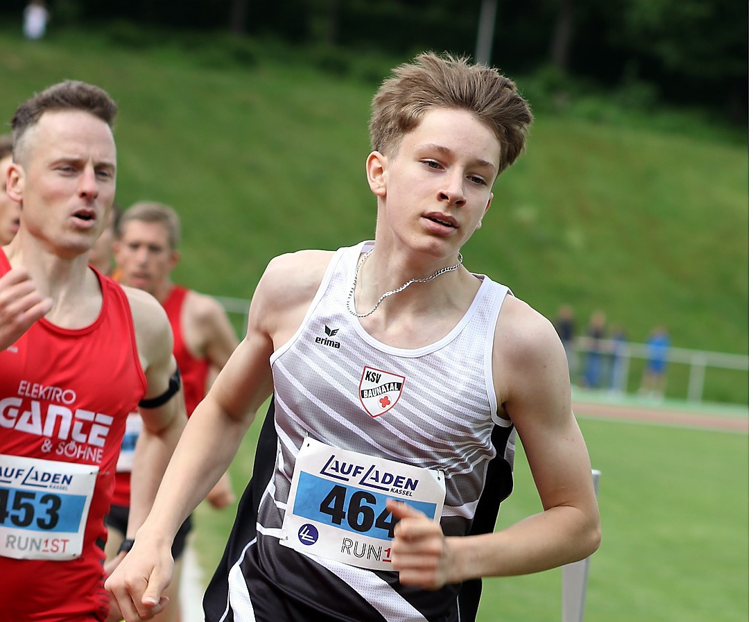 Als Gesamt-Dritter in 18:41 Minuten über fünf Kilometer der Männer sammelt Martin Herbold (TuSpo Borken) weitere wichtige Wertungs-Punkte für die Kombi-Wertung. Ralph Hassenpflug (TSV Remsfeld/21:57) bleibt der Top-Athlet der M 60. Luis Jenner (Gei/22:10) bezwang in der M 14 seinen Kontrahenten Finn Wanke (Laufteam Kassel/23:24). Stark präsentierte sich der heimische Nachwuchs über 1000 Meter. In 3:30 lief Louis Lenz (Felsberg/KSV) an die Spitze der U 16 der Jungen. Erstmals blieb Luisa Marie Fröhlich (Gei/3:56) im Feld der Mädchen unter vier Minuten und übernahm zudem die Gesamt-Wertung im Cup. (zct)